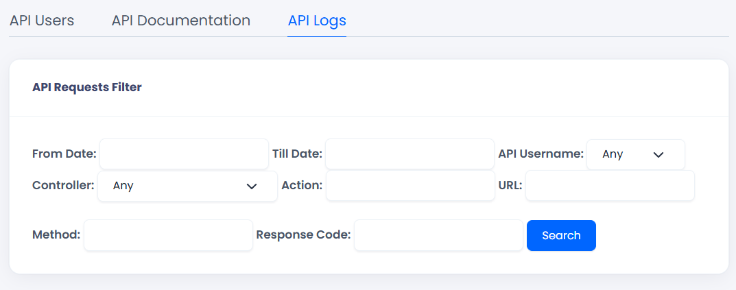 You can monitor API usage and performance in the API Logs tab in Settings > API Management. Run the search filters at the top of the table to find the needed records using the date, username, and other filter parameters. Then, you can view the records on the screen or export them as a file.