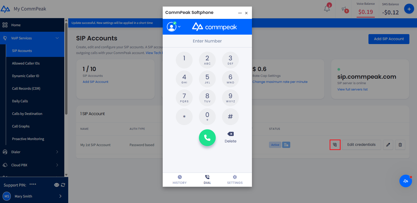 NOTEYour built-in CommPeak Softphone works with your JWT-enabled SIP account, similar to how the Dialer Softphone widget works.
