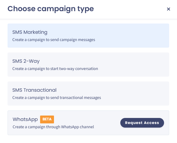 Creating SMS Transactional and WhatsApp campaigns is a Beta feature that is not available to all users by default. If you are interested in trying it, you first need to request access.