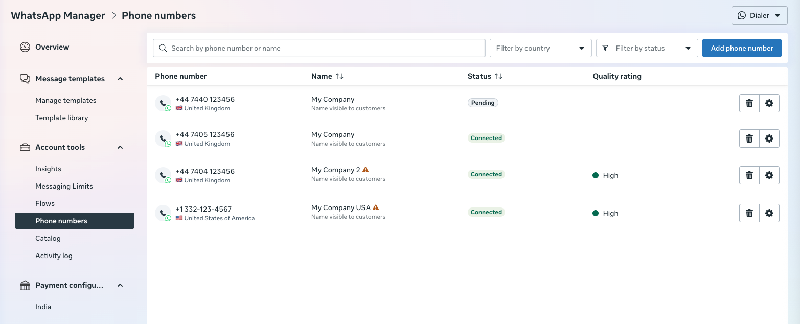 Ensure your number is active for calls. If it isn’t, register the number, enable two-step verification, and verify it’s available for templates before using it for calls.