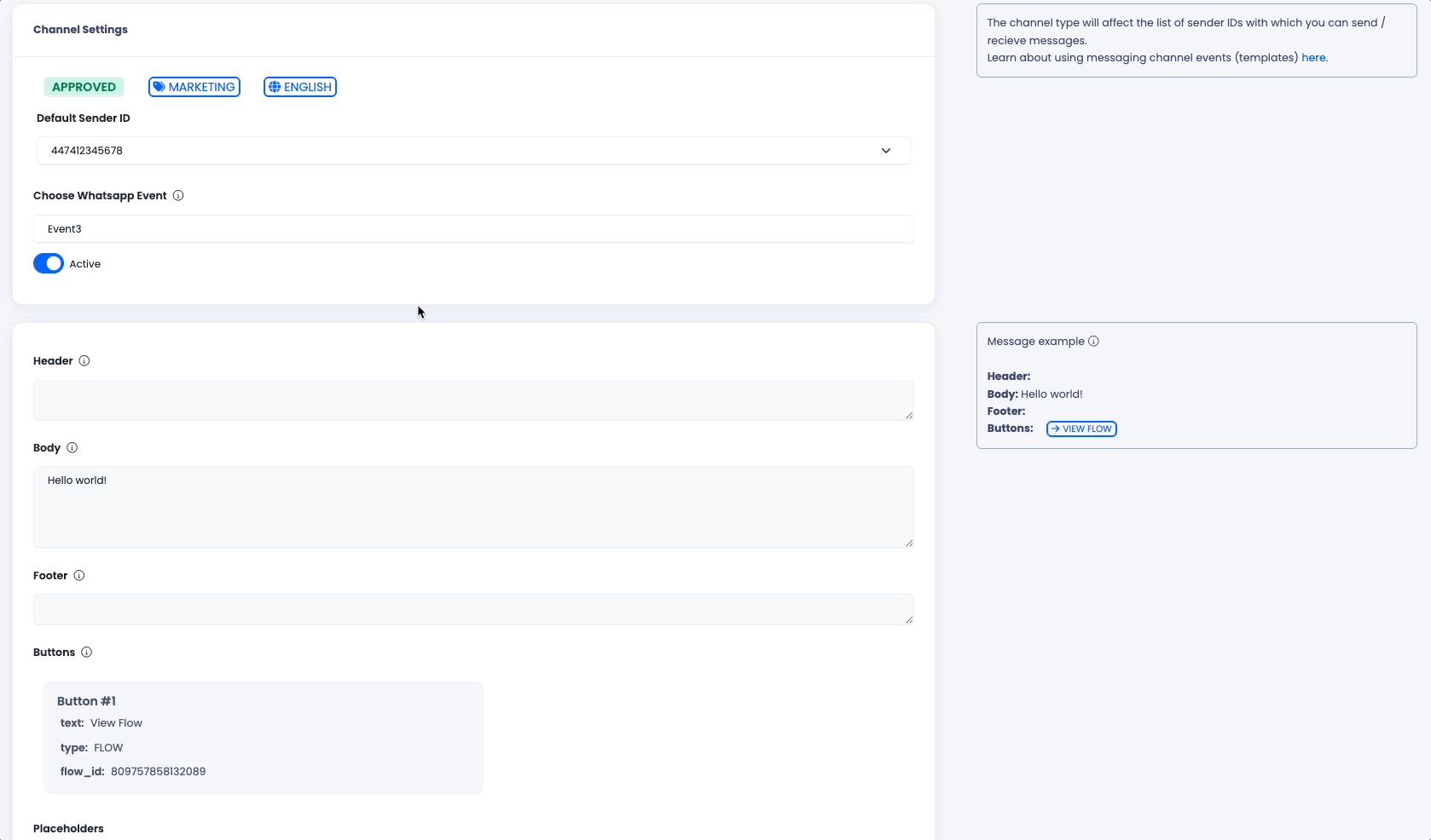 | Meta Status | This information is received from Meta. Once the template is activated by Meta, it is stated as "APPROVED" |