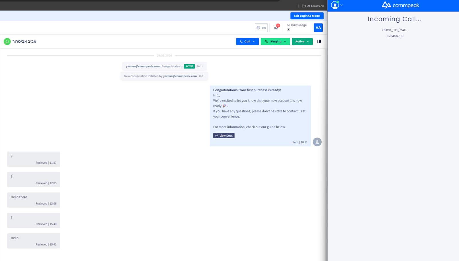 After you select the sender, an incoming call will be placed to your Softphone and you will see the WhatsApp Call button change to Ringing: