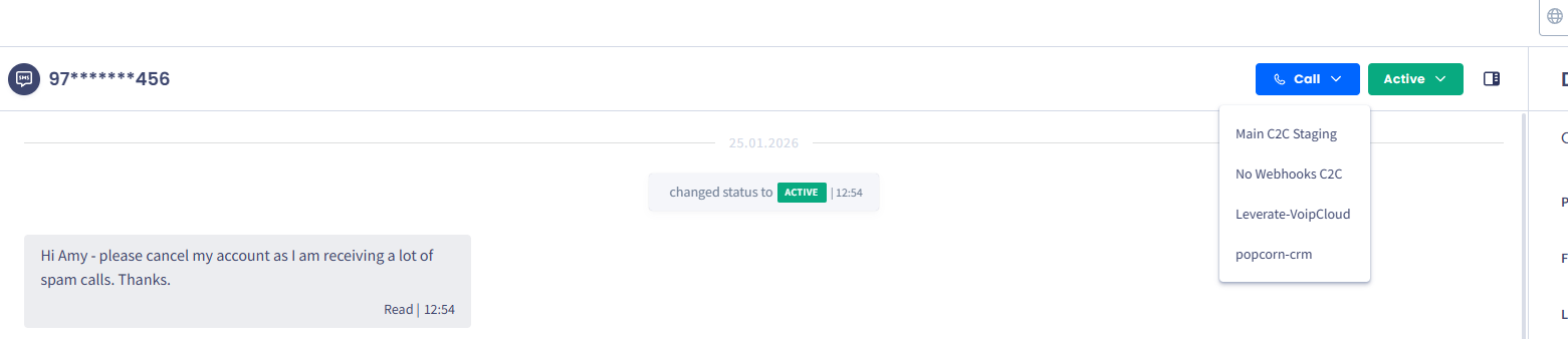 Once a contact/lead replies or grants permission, in the upper right, you will see the WhatsApp Call Click2Call button: