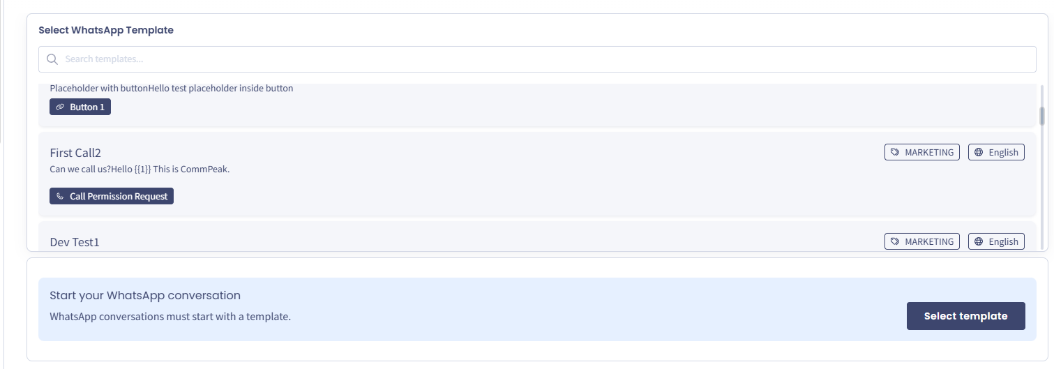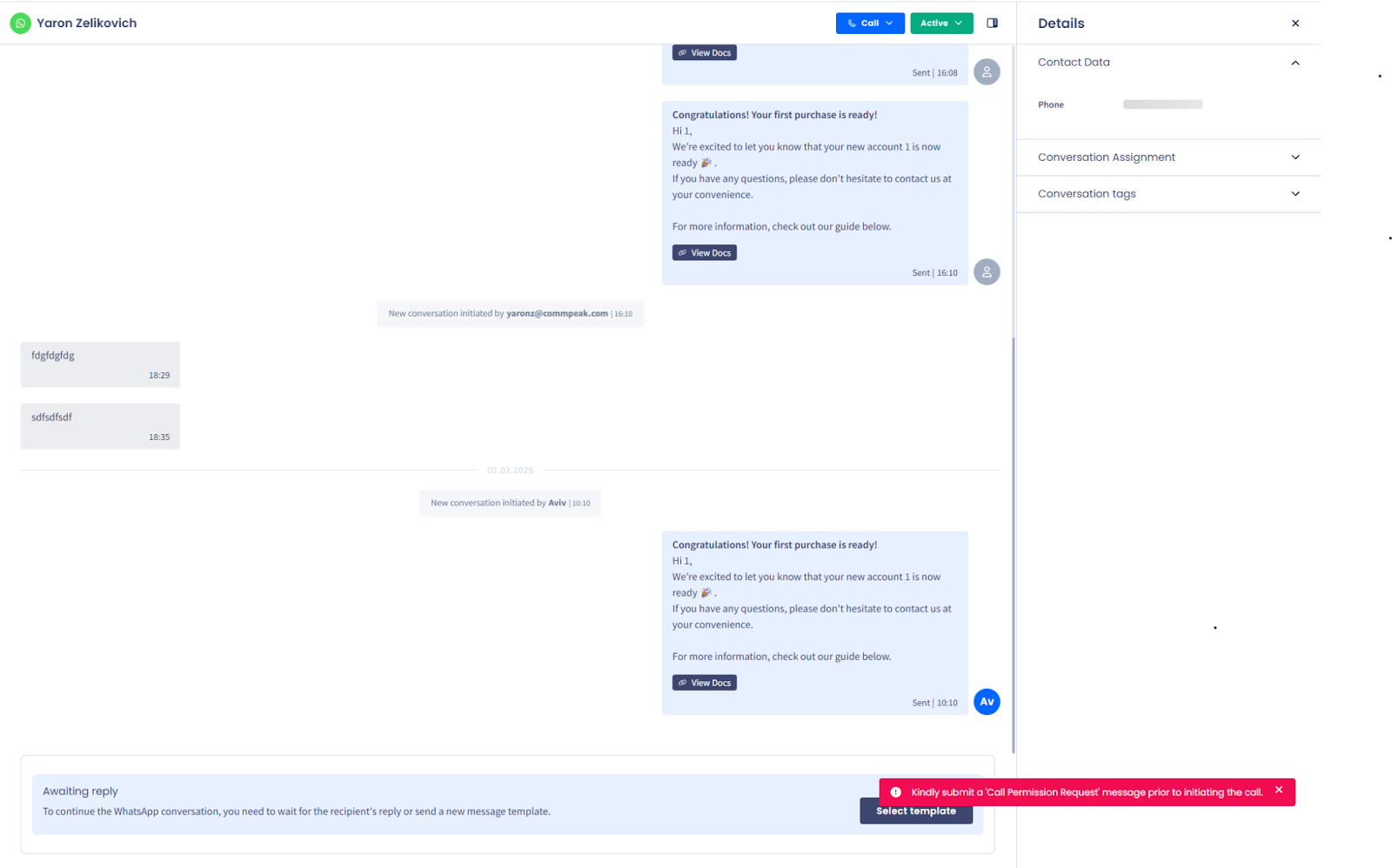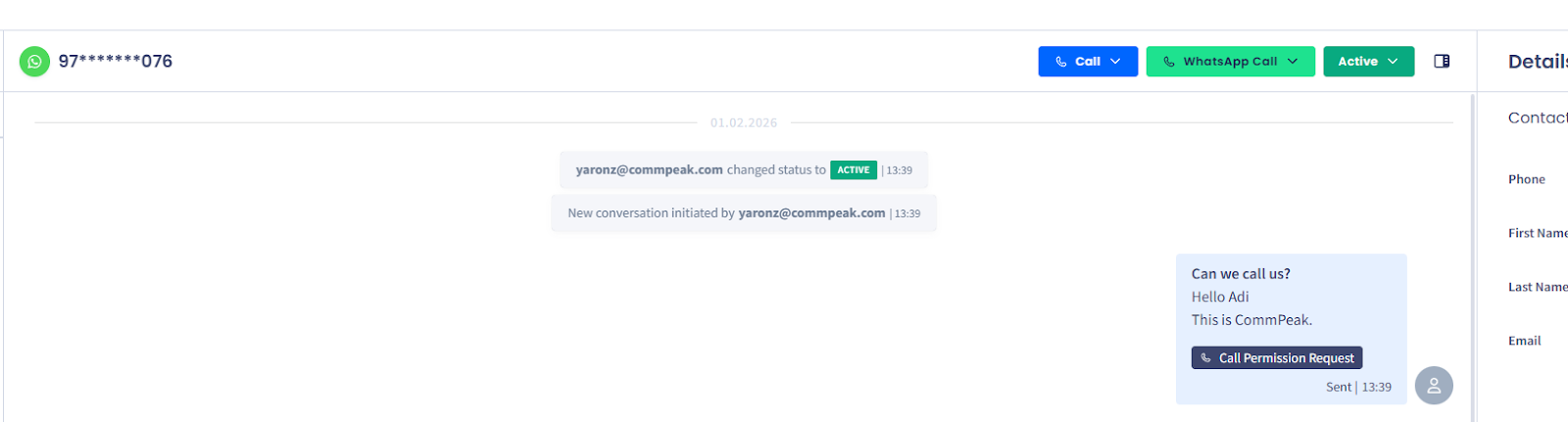 To comply with WhatsApp’s communication policies, initiating a WhatsApp Business call requires a pre-approved template to request call permission from the contact/lead. The user must approve the call for a limited or indefinite time before the agent is able to see and use the WhatsApp Call button.