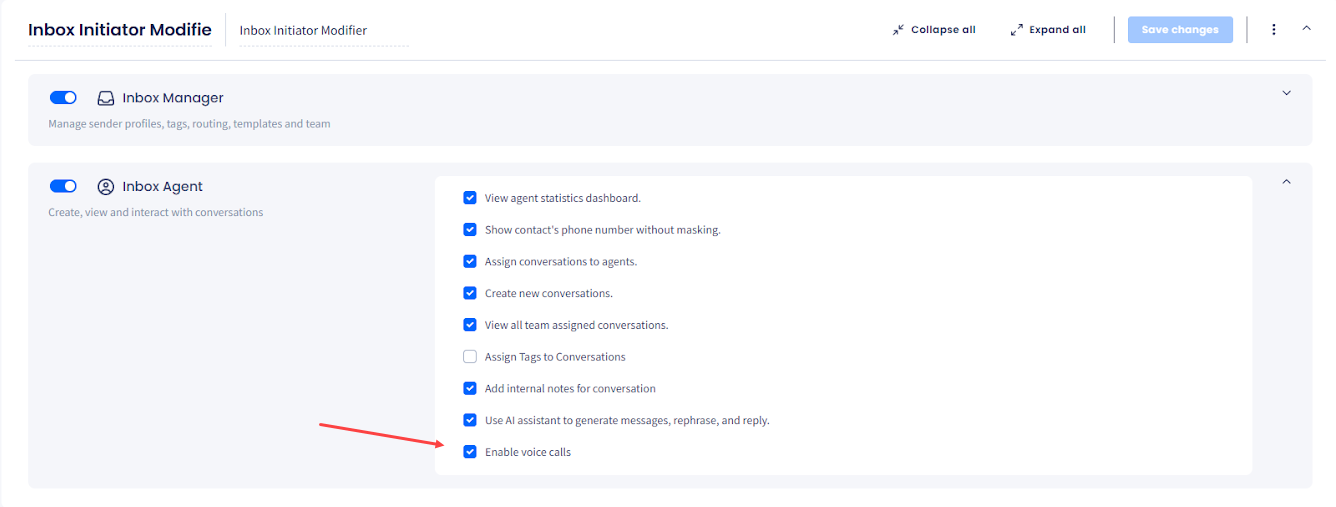 The Inbox Admin or Inbox Manager must enable the corresponding permission (Enable voice calls) for the Inbox Agent before this agent can make phone calls.