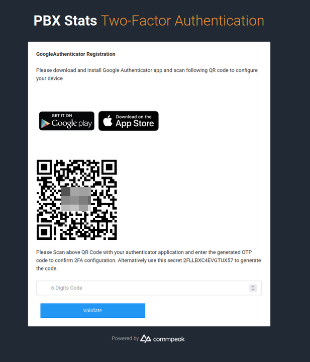 Log in securely to PBX Stats as a manager user, including setting up two-factor authentication using email codes, the Google Authenticator app, or backup codes.