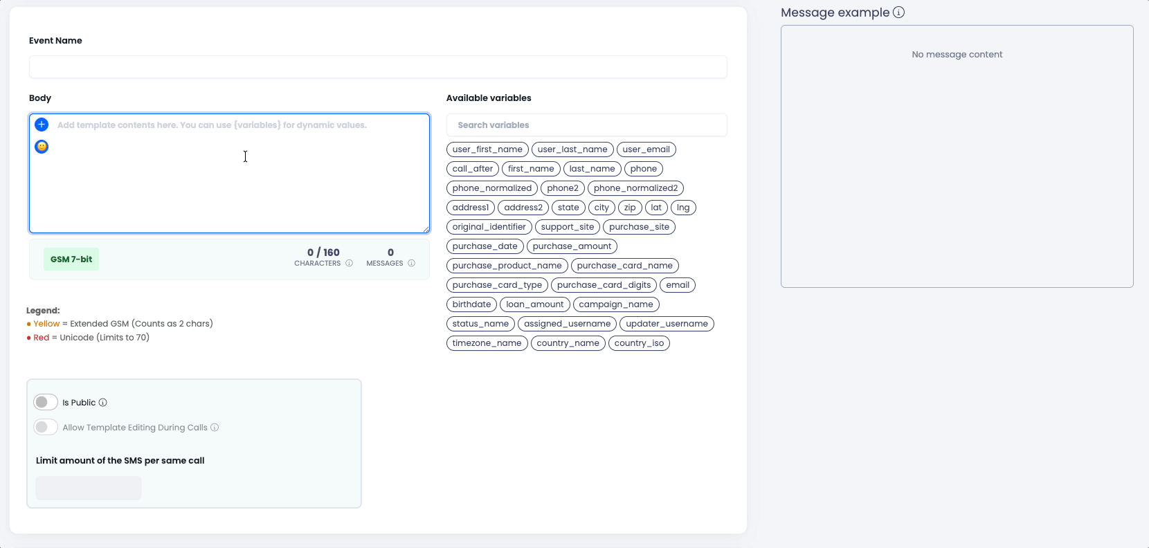 All messaging channels support events that include predefined text templates with placeholders for personalization based on lead details.