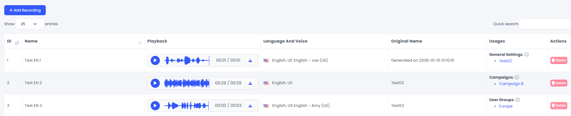 | Usages | This column displays all active locations for a recording, providing direct links to the relevant IVR, Campaign, Group, or General Settings pages where it is currently in use |