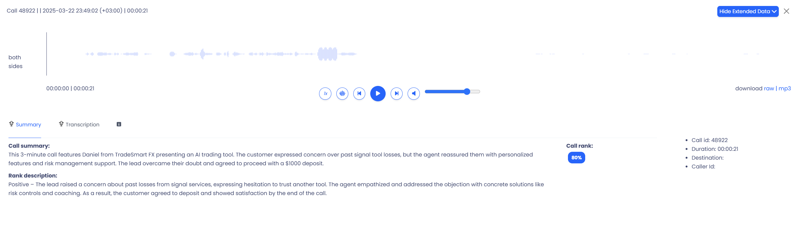 To view additional call details, click on Extended Data to open the whole Show Transcription section, which includes the call summary, rank description, and complete searchable transcript with download options.