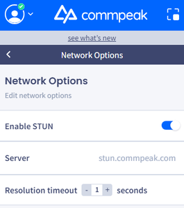 In Network Options, you can enable STUN (Session Traversal Utilities for NAT) and TURN options, your softphone's guaranteed connection pathway.