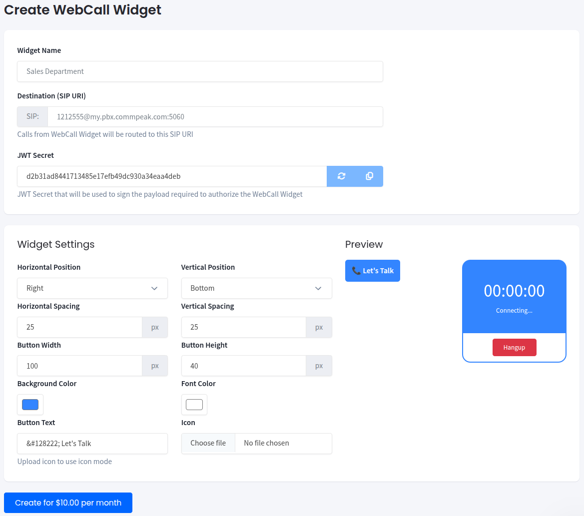 The CommPeak WebCall Widget allows you to embed a Click-to-Call button directly onto your website. Using standard WebRTC protocols, it transforms any browser into a functional phone, routing calls through a SIP destination to your your PBX or VoIP infrastructure. This allows visitors to connect with your sales or support teams instantly, without ever leaving your page.
