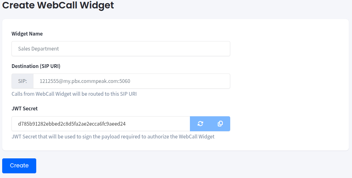 WebCall Widget Creation form